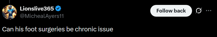A foot surgery for torn ligaments is definitely a concern going forward with one possible diagnosis being a Lisfranc. Any kind of foot surgery could be a chronic issue given the trickiness of the complex small anatomy. It’s reassuring however that he has played 2 strong seasons since the surgery.