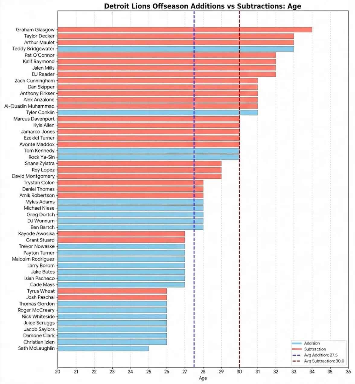 Here is a re-print of charts from my Lions Offseason Health Review: Additions vs Subtractions that display the offseason roster changes. As you can see, there has been a noticeable shift in the roster towards younger, healthier players.