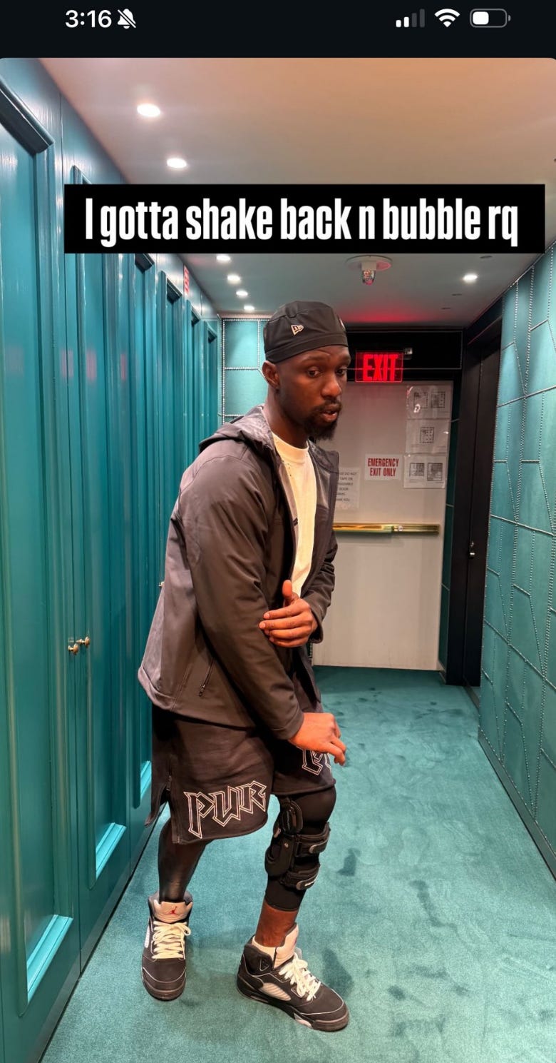 Here is a pic of him wearing a knee brace (credit @j_ekks for the spot).