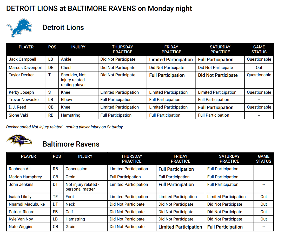 November 30 (Week 14) Dan Campbell provides first details of injury.