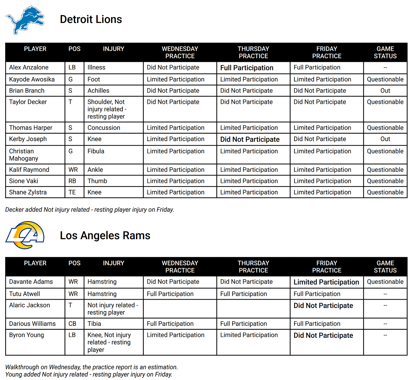 The Rams have an enviously tiny injury report with nobody “out” and only a single “questionable”. They did lose RT Rob Havenstein, TE Tyler Higbee and S Quentin Lake to IR earlier in the season.