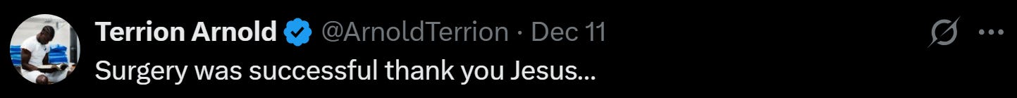 Terrion Arnold had shoulder surgery this week. Expect him to be fully ready for next season.