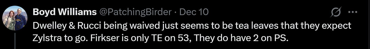 As a reader wisely noted, the Lions let go of 2 TE’s this week (Ross Dwelley, Hayden Rucci) which could signal that Zylstra is ready.