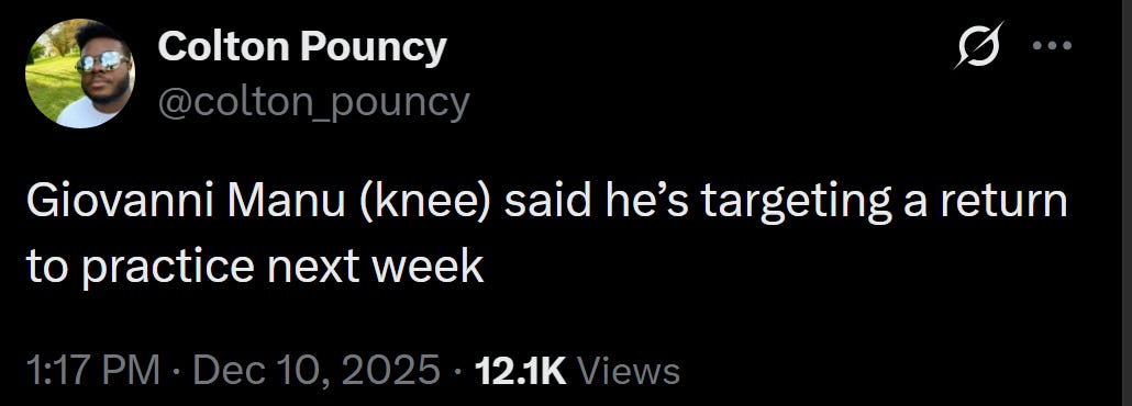 Giovanni Manu, who is on IR with a knee, told Colton Pouncy that he’s targeting a return next week.