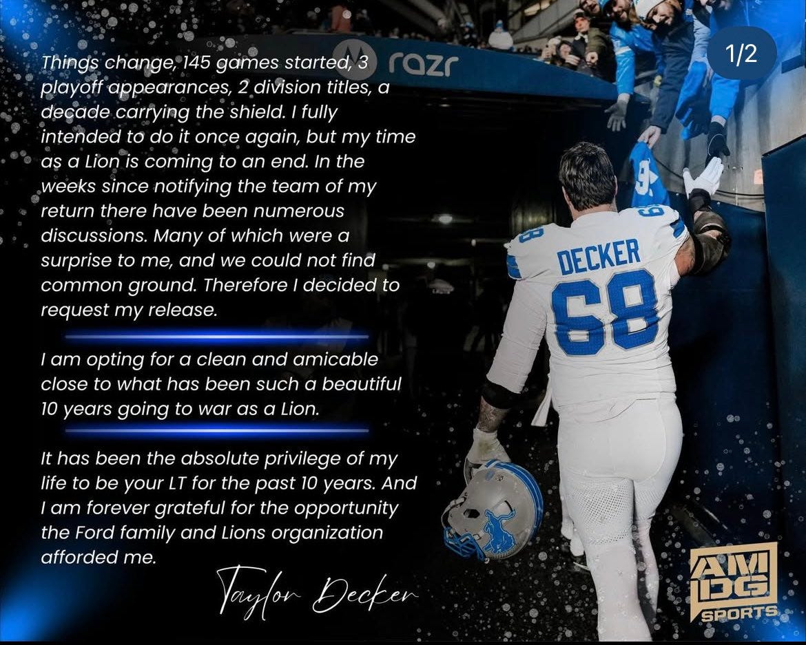 There was still hope that some kind of compromise or reconciliation might occur, but that didn’t happen. The Lions indeed released Decker on the 1st day of the NFL free agency negotiating period.